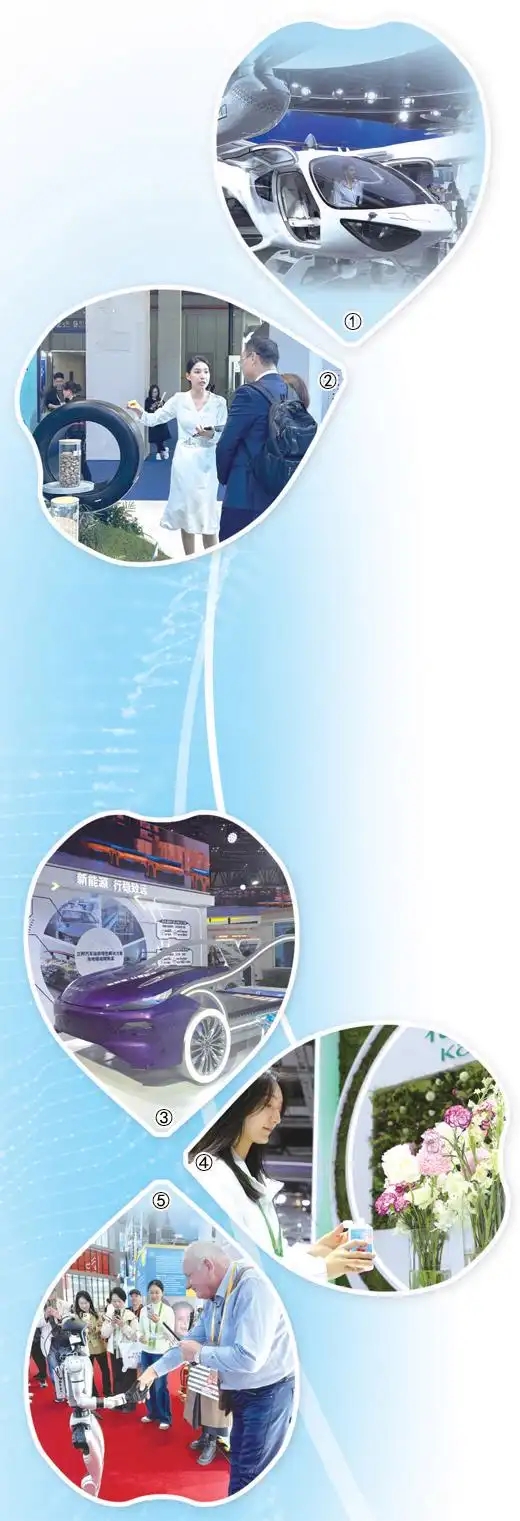 圖①:觀眾體驗上海時的科技電動垂直起降飛行器。 本報記者 王 慧攝 圖②:米其林展臺工作人員向參觀者介紹一款可持續材料比例高達71%的輪胎。 本報記者 劉玲玲攝 圖③:立邦展臺展示新能源汽車綠色涂裝解決方案。 本報記者 邢 雪攝 圖④:花王展臺工作人員展示本屆進博會首展產品&ldqu...…