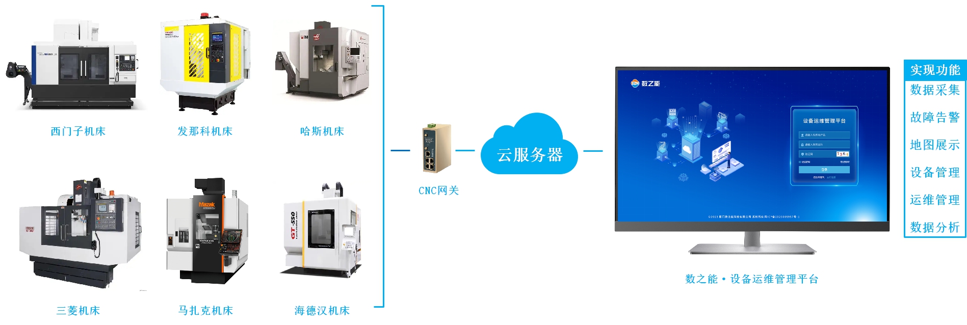 數之能設備數據采集平臺(IOT數據中臺)實現與各種工業設備(PLC、儀器儀表、傳感器、CNC機床、機器人等等)連接,實現對現場的各種工業數據的數據采集,雙向控制;同時將數據進行標準化處理后存儲到平臺,為各種工業物聯網平臺、工業互聯網平臺和工業軟件提供開放的數據服務和接口。