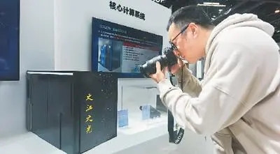 觀眾在2023第二屆全球數字貿易博覽會上拍攝“之江之光”超算裝置模型。 龍 巍攝(人民圖片)