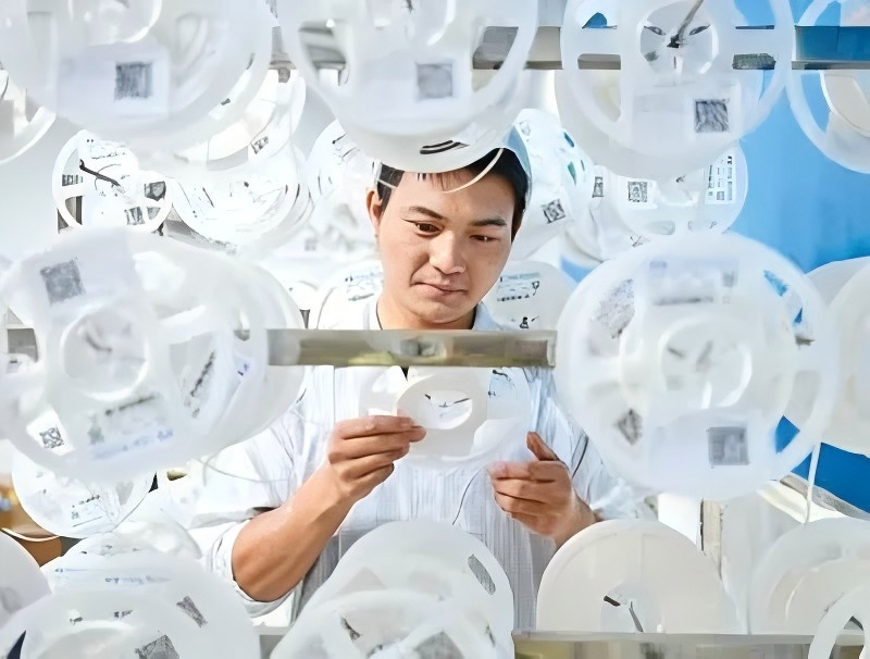 在江西省撫州市的一家5G電子元器件制造企業(yè),一名技術(shù)工人在數(shù)字化車間生產(chǎn)5G網(wǎng)絡(luò)通訊光纖交換機電源元器件。朱海鵬攝(人民視覺)