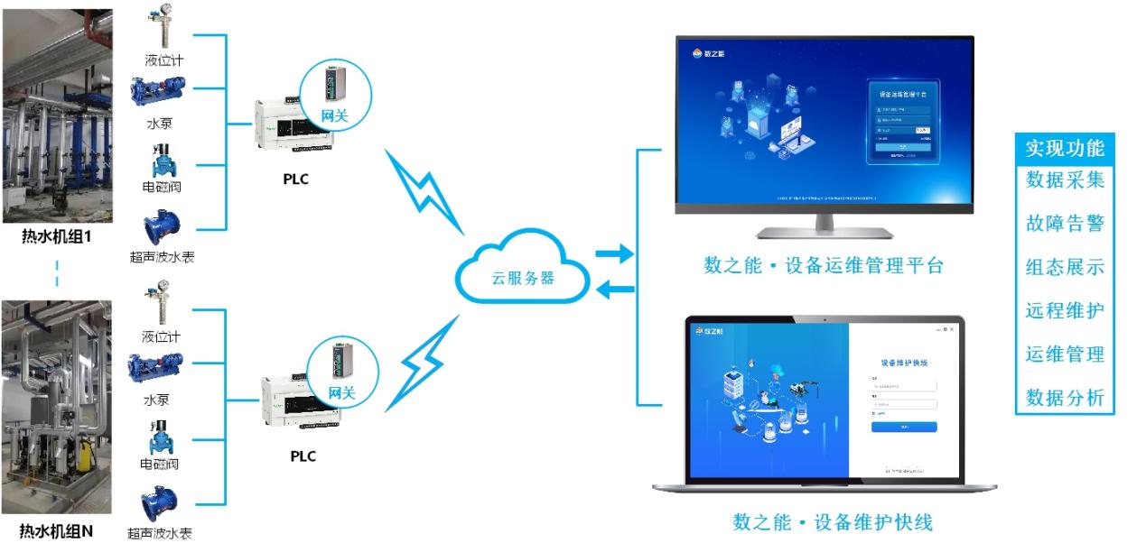 熱水機組數(shù)量多、分布廣,依賴現(xiàn)場人員巡查故障再報修,而企業(yè)缺乏集中監(jiān)控管理的手段,導(dǎo)致出現(xiàn)故障無從得知、維護(hù)不及時等問題,影響到居民用水安全與穩(wěn)定。