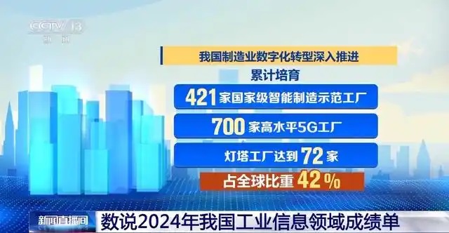 累計培育421家國家級智能制造示范工廠、700家高水平5G工廠,燈塔工廠達到72家,占全球比重42%。