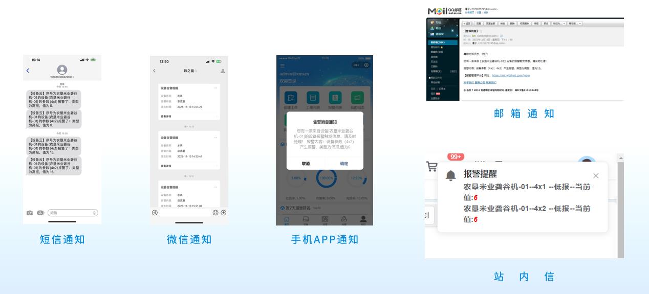 當觸發設備報警規則時,就會立即通過微信、短信、郵件等方式通知到管理人員,同時展示告警設備、告警類型、告警時間,方便隨時查詢。