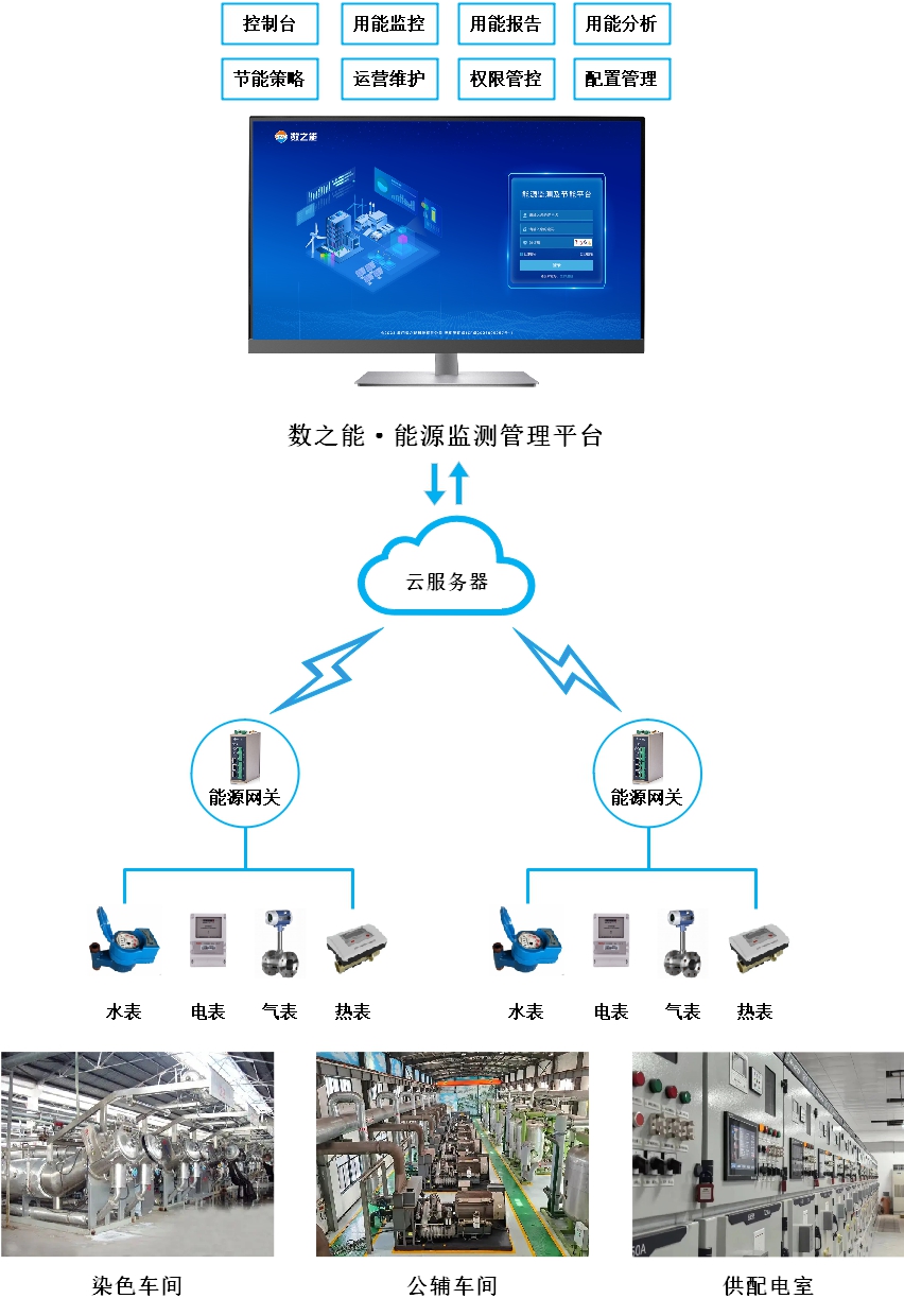 工信部等六部門印發《紡織工業數字化轉型實施方案》指出:加快工業互聯網部署;釋放數據要素價值;深化數據全生命周期管理,實時采集設備運行狀態、能耗信息、生產信息等數據,實現對工藝、質量過程等深度感知。在此背景下,數之能基于能源監測管理平臺,為紡織工業能源管理問題提供系統性的物聯網解決方案。