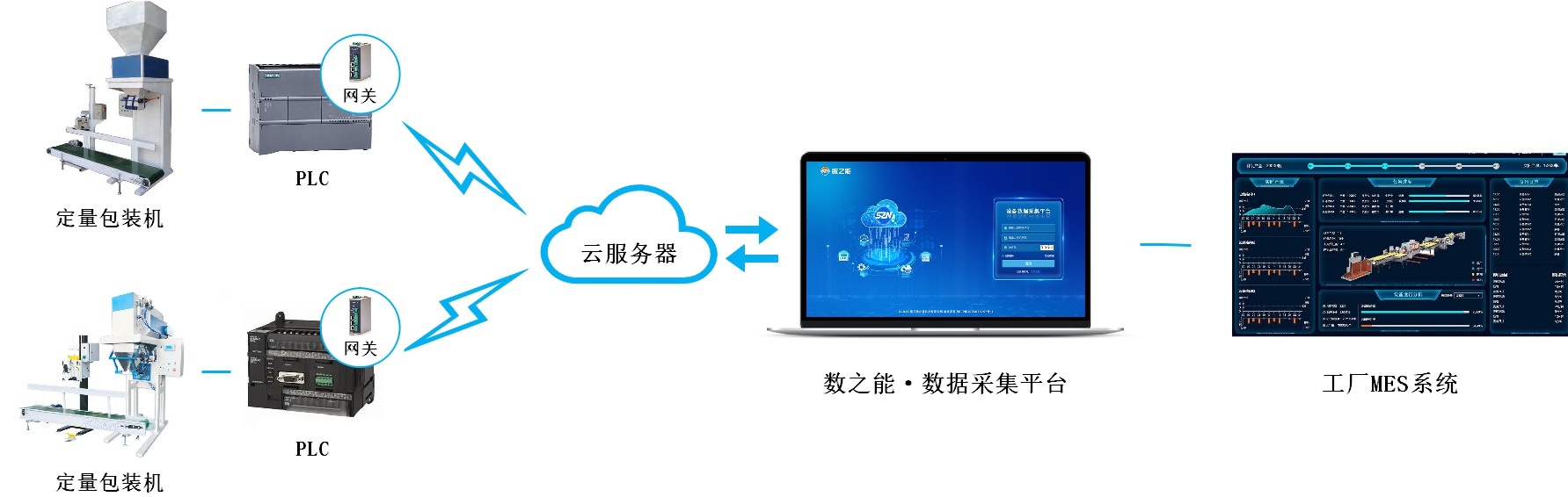 某寵物食品加工廠設(shè)有一個(gè)包裝車間,由多臺(tái)定量包裝機(jī)實(shí)現(xiàn)對各種貓糧、狗糧的自動(dòng)化包裝工作。現(xiàn)在工廠新部署一套MES系統(tǒng),要求實(shí)現(xiàn)定量包裝機(jī)與MES系統(tǒng)的實(shí)時(shí)通信,方便隨時(shí)了解設(shè)備運(yùn)行狀態(tài)與生產(chǎn)信息,從而做出科學(xué)合理決策。對此,數(shù)之能提供基于數(shù)據(jù)采集平臺(tái)的物聯(lián)網(wǎng)解決方案。