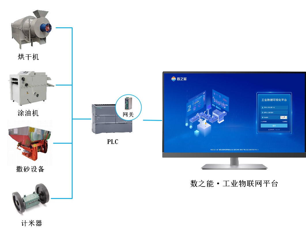 對(duì)此,數(shù)之能通過(guò)本地部署工業(yè)物聯(lián)網(wǎng)平臺(tái),接入烘干機(jī)、涂油機(jī)、撒砂設(shè)備、計(jì)米器等設(shè)備PLC,實(shí)時(shí)采集設(shè)備運(yùn)行參數(shù)并實(shí)現(xiàn)可視化處理,從而實(shí)現(xiàn)對(duì)設(shè)備的組態(tài)監(jiān)控、在線(xiàn)管理、故障告警、遠(yuǎn)程控制、運(yùn)維管理等功能,從而為生產(chǎn)管理、數(shù)據(jù)分析等工作提供全面可靠的數(shù)字化支持,促進(jìn)企業(yè)制定科學(xué)合理決策、實(shí)現(xiàn)降本增效。