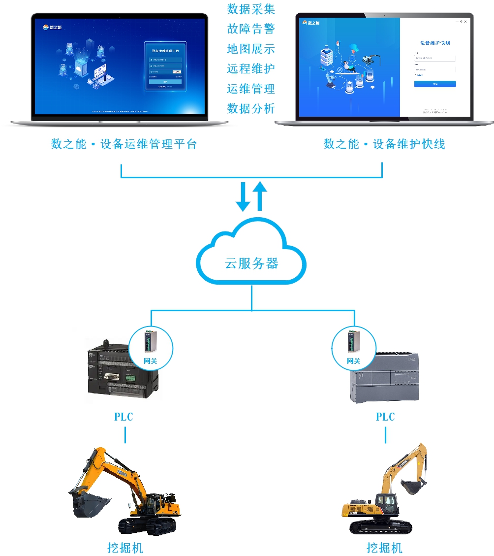 通過工業智能網關接入挖掘機的PLC控制器,能夠實時采集設備運行狀態與工作參數,并通過5G/4G等網絡上傳云服務器中;部署于云服務器上的設備運維管理平臺即可接收并解析數據,從而以可視化界面提供遠程監控、故障告警、運維管理、數據統計等功能,為設備制造商提供高效率、低成本的數字化運維支持,促進企業全方位發展。