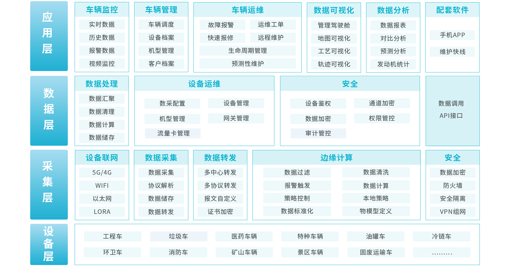 數(shù)之能車輛管理平臺,通過大數(shù)據(jù)、物聯(lián)網(wǎng)、移動互聯(lián)網(wǎng)等技術(shù),對車輛進行數(shù)據(jù)采集傳輸,實時將車輛關(guān)鍵數(shù)據(jù)信息和定位信息采集上傳至車輛管理平臺進行監(jiān)控和分析,檢測車輛設(shè)備運行狀態(tài)、監(jiān)控車輛運行軌跡、提醒警告異常情況,及時發(fā)現(xiàn)車輛異常,幫助運營 管理人員對車輛進行管理、幫助售后維護人員進行遠程處理故障,降低車輛運行過程中發(fā)生事故的概率,實現(xiàn)對車輛進行全生命周期管理,實現(xiàn)對車輛運營管理、運行調(diào)度、售后維護一體化。